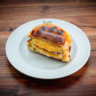 Bikini de pan de brioche relleno de pastrami de carne de buey del capricho, pepinillo encurtido, queso cheddar ahumado y queso payoyo rallado