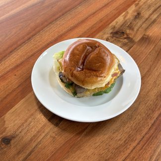 Brisket de black angus cocinado durante 12h marcado a la brasa con pan brioche, lechuga, cebolla encurtida, queso cheddar flameado y salsa satay