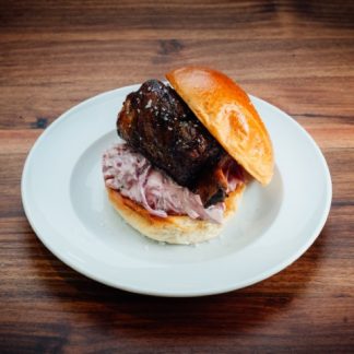 Brioche relleno de Costillar de black angus asado 12h con hueso y ensalada coleslaw darvaza