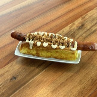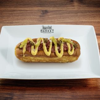 Frankfurt XL marcado a la brasa con pan de brioche marcado con mantequilla, salsa de kimchi, lima y cilantro y cebolla frita