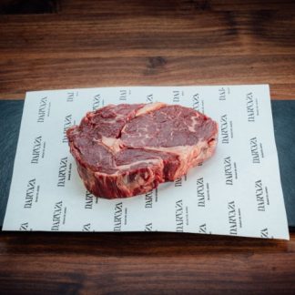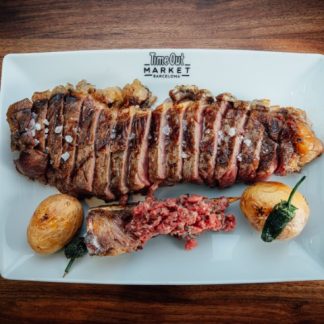 Chuletón nacional madurado 60 dias a la brasa con su propio tartar de la carne pegada al hueso. Papa asada con chimichurri y pimiento del padrón