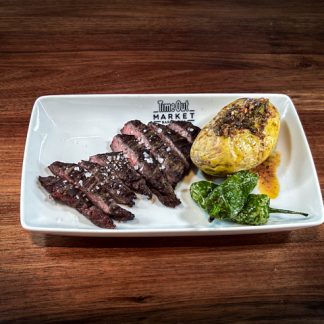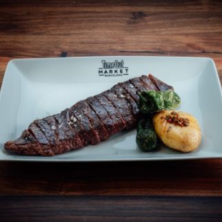 Vacío de ternera Angus Argentina a la brasa con patata asada con chimichurri y pimiento del padrón.