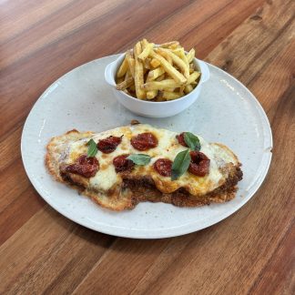 Milanesa de ternera frita y gratinada al horno de leña con mezcla de 3 quesos y tomates cherri asados, con patatas fritas