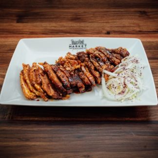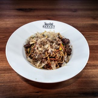 Solomillo de buey salteado, setas shiitake, aguacate, cebollitas caramelizadas