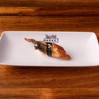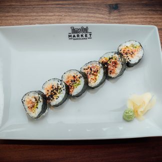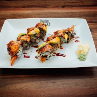 Langostino en tempura y pepino cubierto de anguila y aguacate.