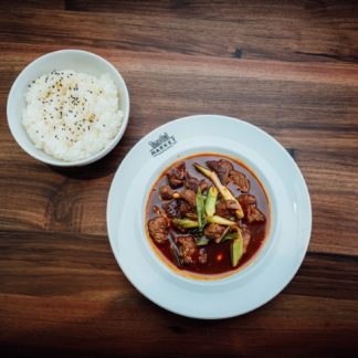 Filete de buey salteado con cebollitas, cacahuetes y chili, acompañado de arroz
