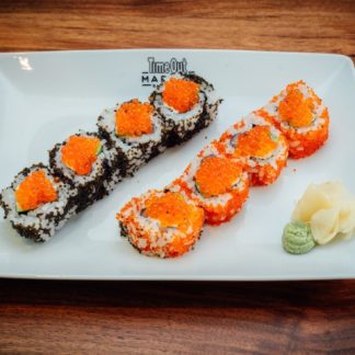 Prawn tempura, avocado, and cream cheese, topped with butterfish and “anticucho” sauce.