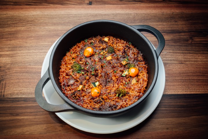 Arroz con verduras al horno y Romesco