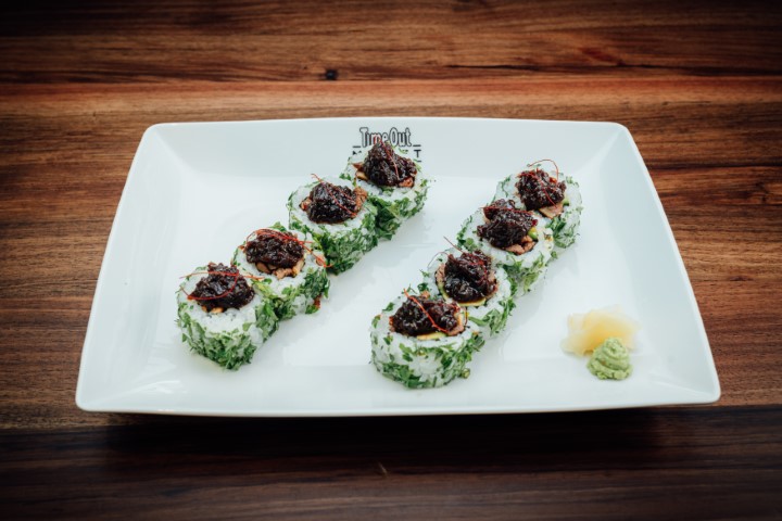 Solomillo de buey salteado, setas shiitake, aguacate, cebollitas caramelizadas