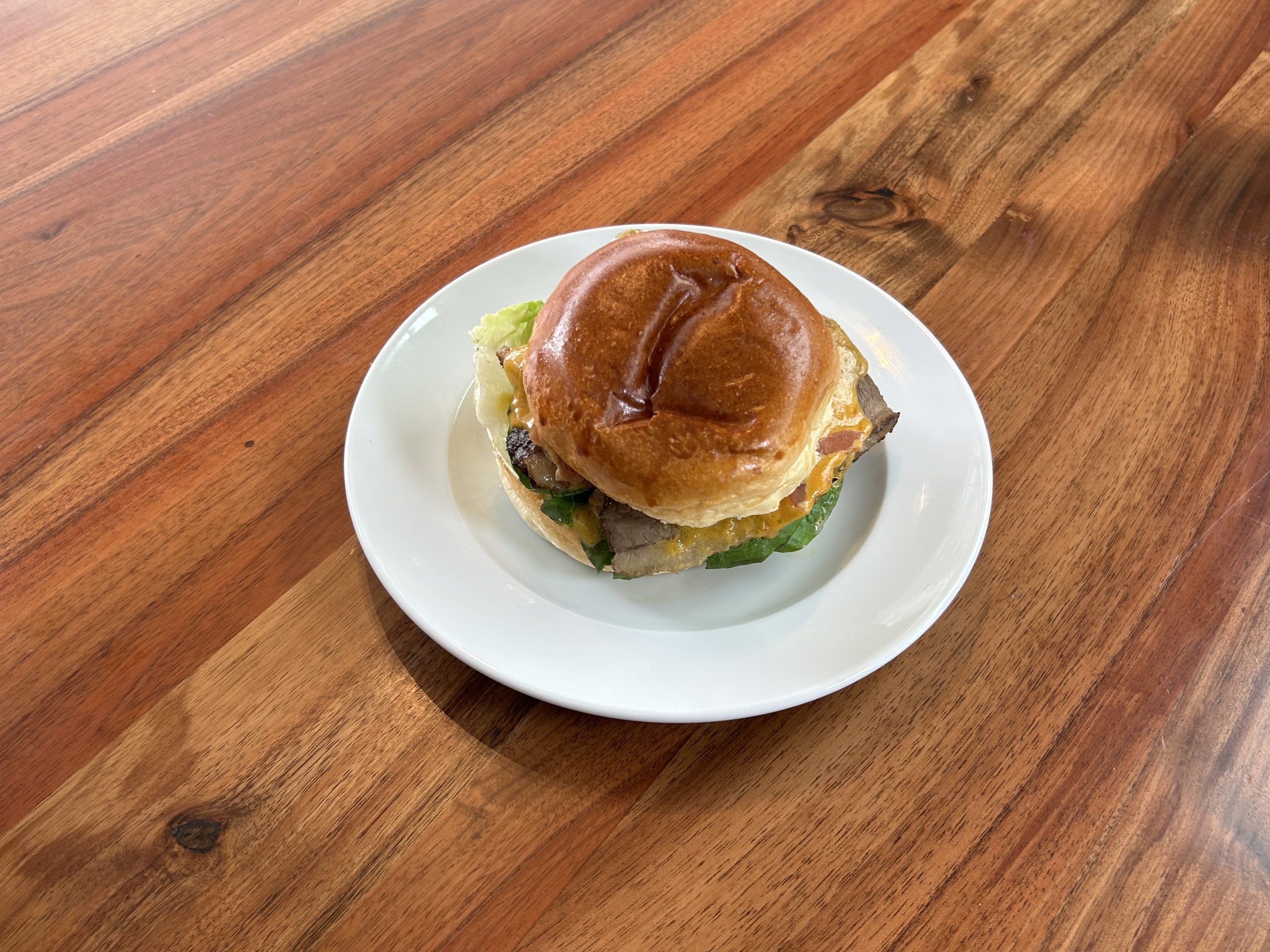 Brisket de black angus cocinado durante 12h marcado a la brasa con pan brioche, lechuga, cebolla encurtida, queso cheddar flameado y salsa satay