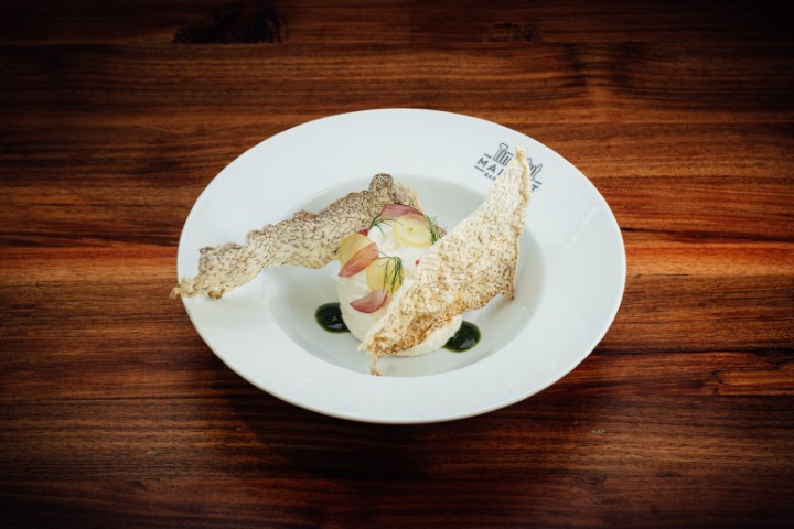 Una brandada de bacalao muy cremosa con aceite de oliva y un toque de ajo servido con uvas para aportar frescura y la piel del pescado que deshidratamos y freímos en casa para darle textura.