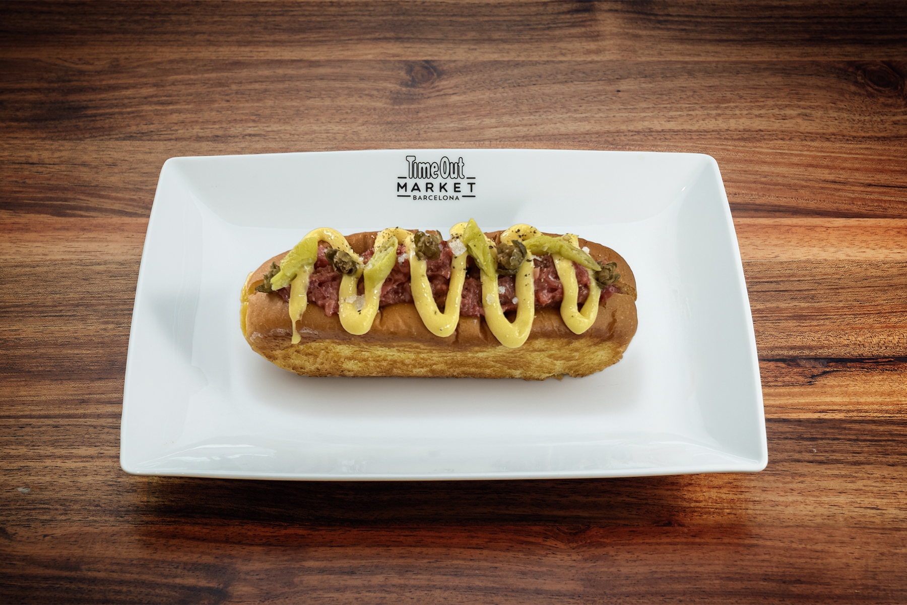 Brioche marcado con mantequilla, relleno de steak tartar de solomillo, holandesa ahumada y alcaparra frita y piparra con brote de pamplinas