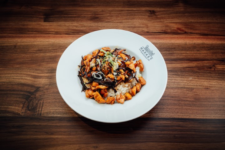 Pollo salteado con salsa teriyaki (dulce), setas shiitake y cebolletas sobre arroz