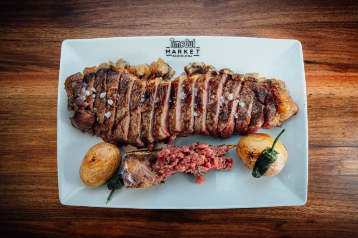 Chuletón nacional madurado 60 dias a la brasa con su propio tartar de la carne pegada al hueso. Papa asada con chimichurri y pimiento del padrón