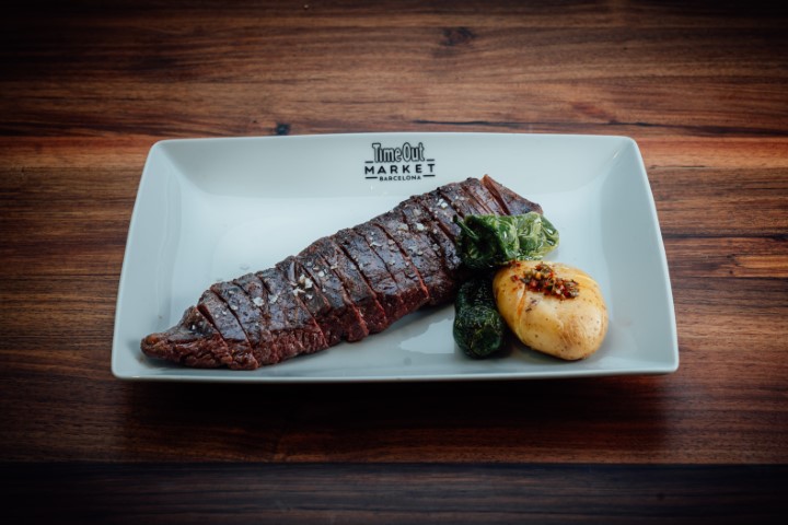 Entranya de vedella nacional a la brasa amb patata rostida amb chimichurri i pebrot del padró