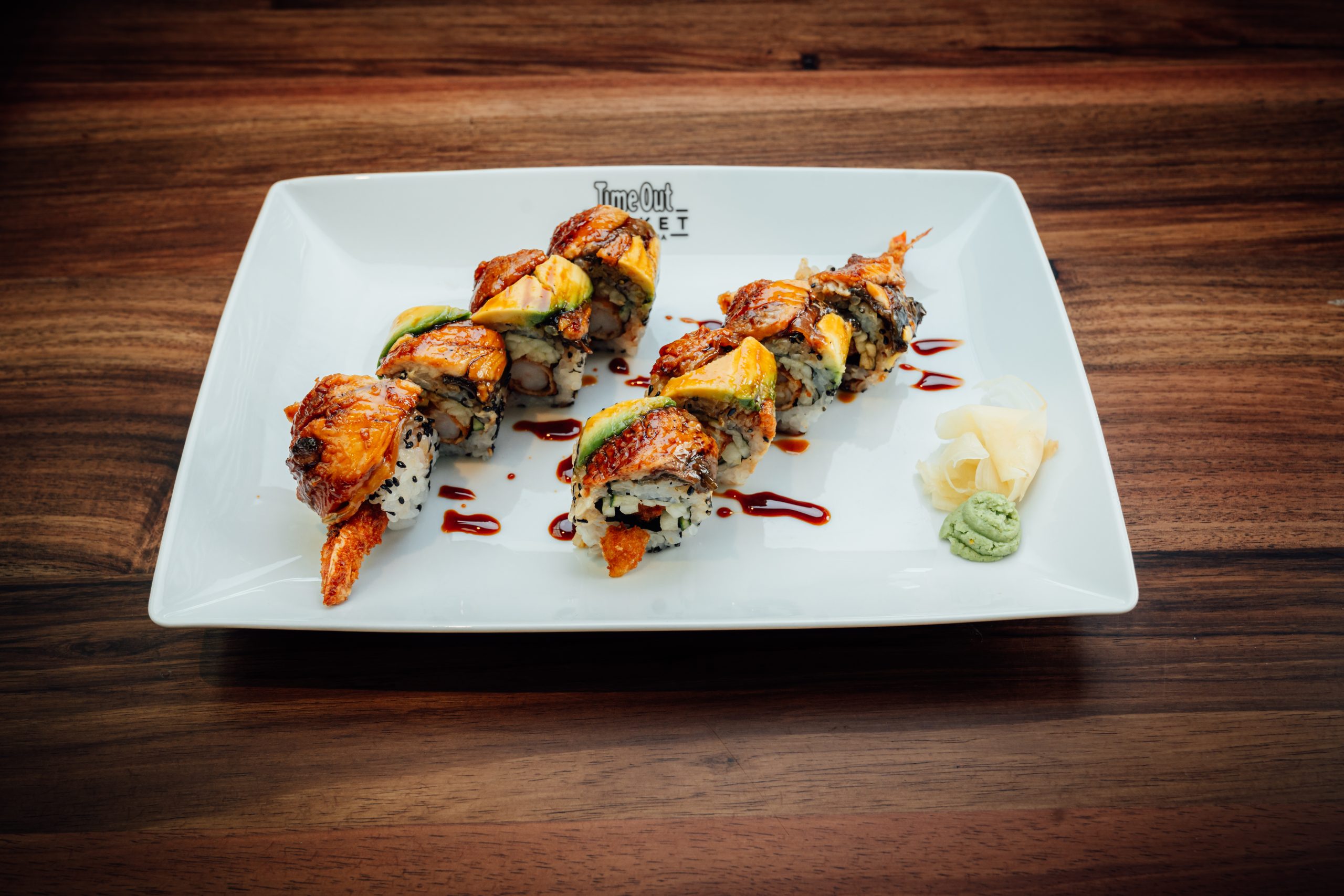 Langostino en tempura y pepino cubierto de anguila y aguacate.