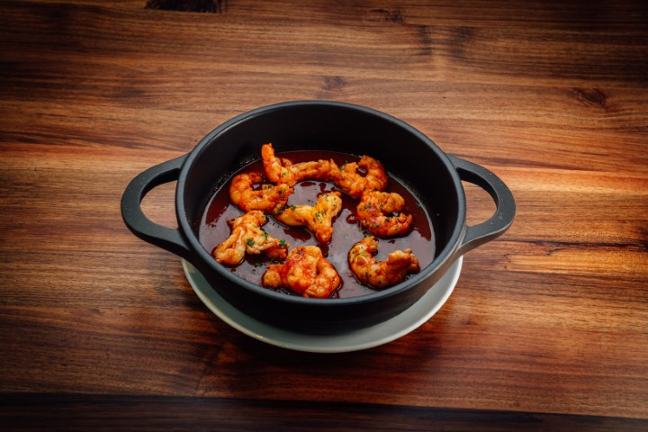 Gambas peladas y salteadas con una salsa de tomate, ajo, polvo de cayena y caldo de gambas y ajo