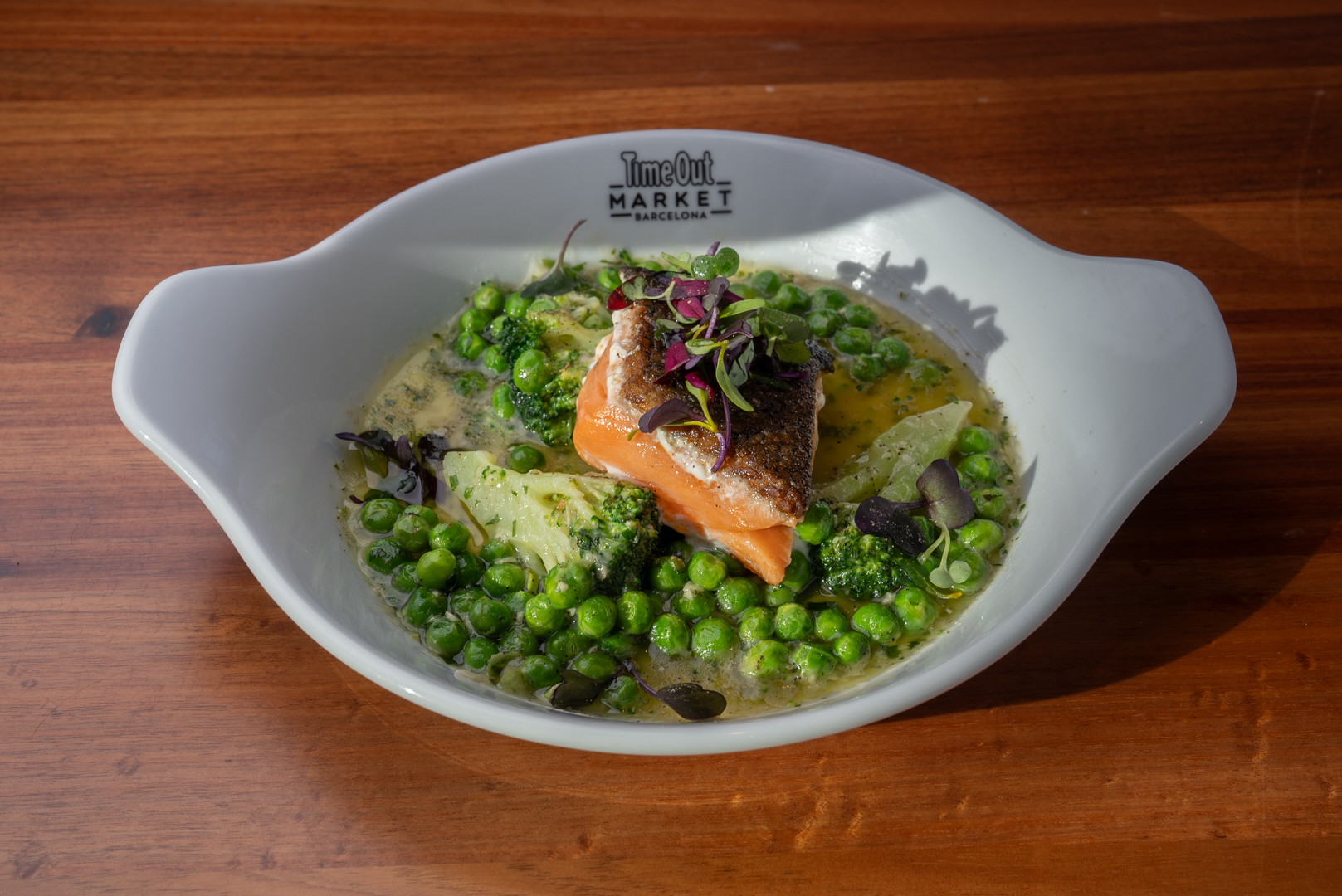 Low-temperature cooked salmon, seared with vegetables and green sauce