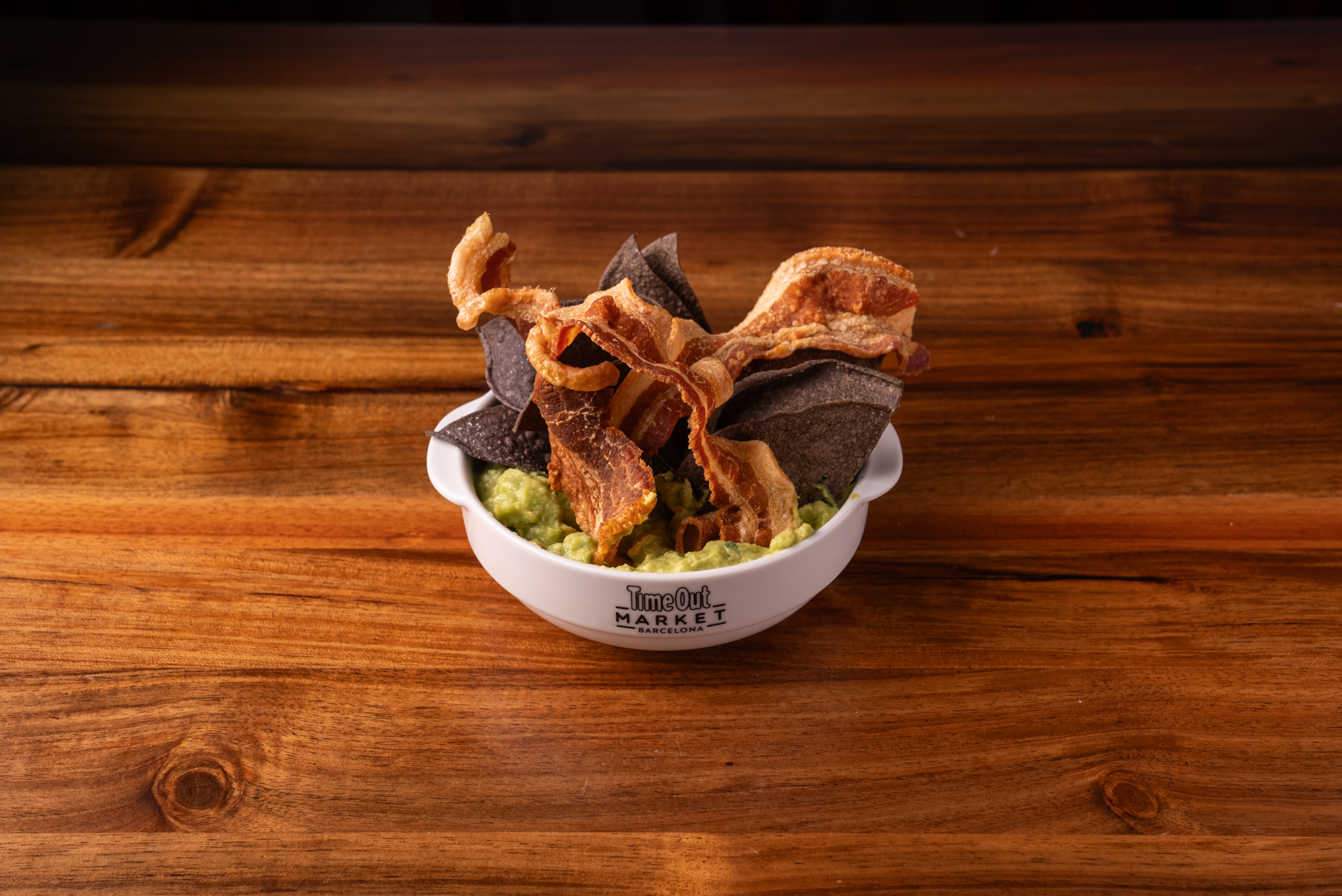 Guacamole tradicional servido con totopos de maíz azul y torreznos de cerdo crujiente.
