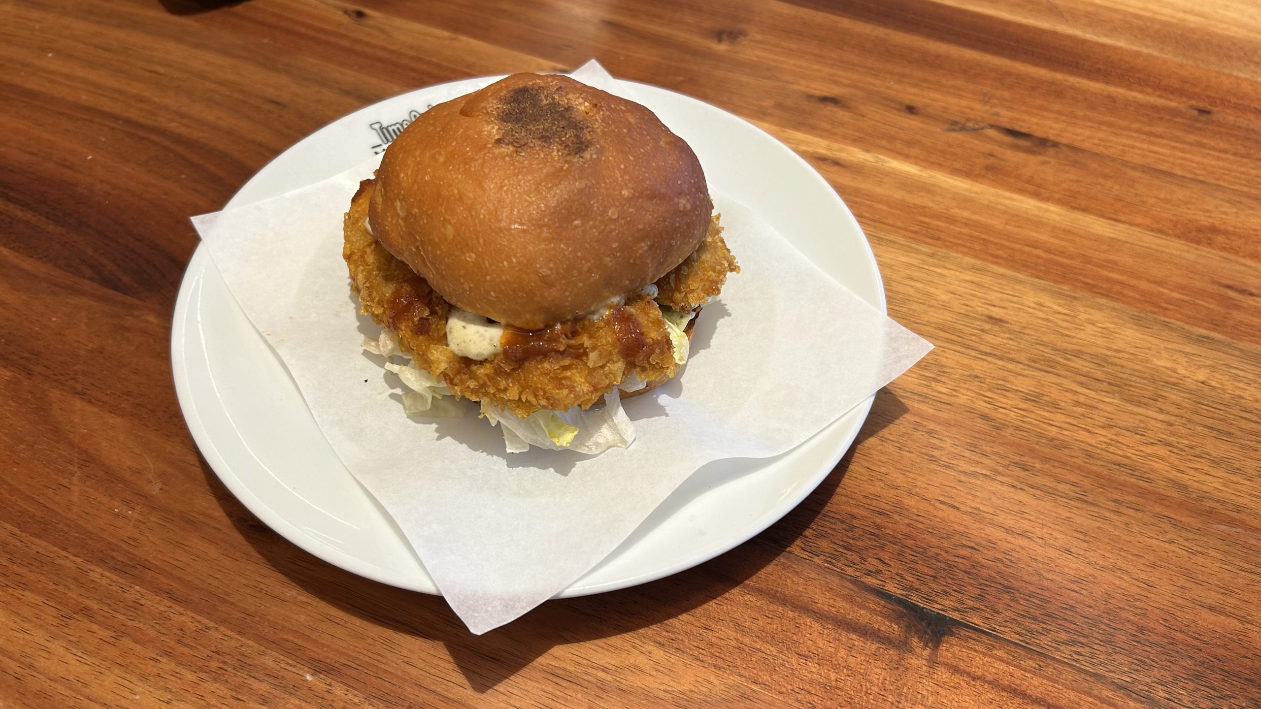 Hamburguesa de pescado con pan de brioche, kimchi y salsa tártara