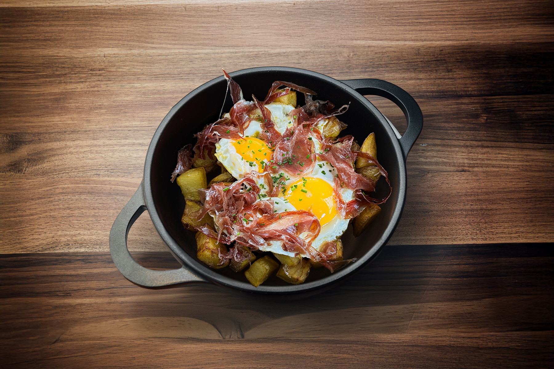 Sartén con base de patatas fritas caseras, cortadas a mano y doradas al punto, acompañadas de huevos fritos de yema cremosa y coronadas con jamón ibérico.