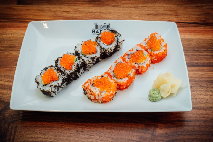Salmón, aguacate y queso crema, cubierto de fresas
