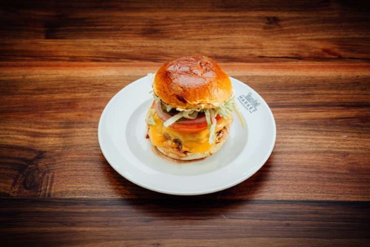 Hamburguesa de vedella amb formatge cheddar, enciam, tomaquet, ceba vermella, cogombrets de la casa i crema de formatge cheddar a cada pa