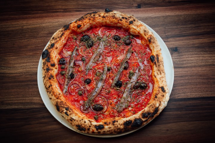 Tomato, Cantabrian anchovies, red onion, capers, olives, garlic, and oregano.