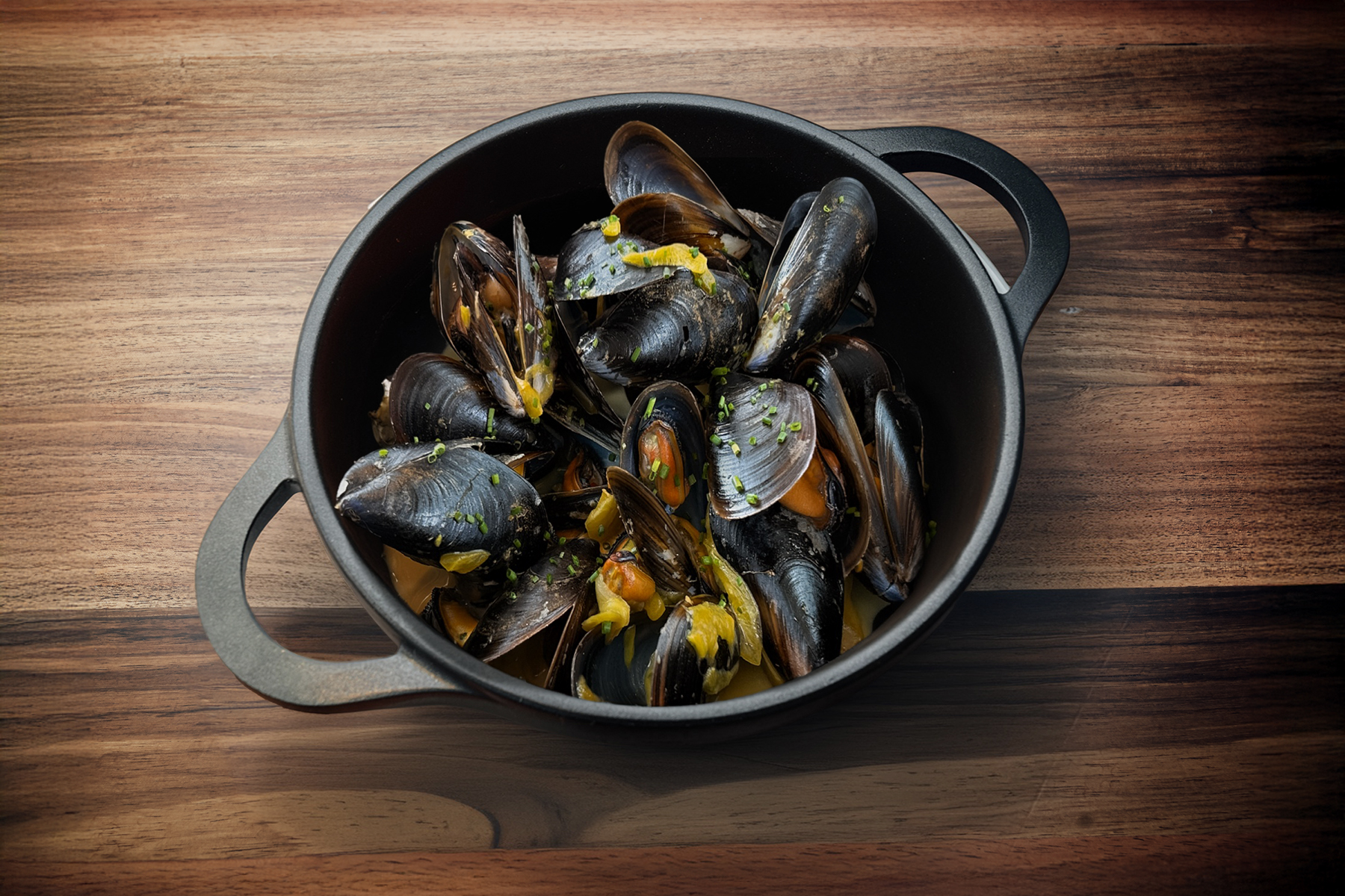 Mejillones cocinados en una cremosa salsa, aromatizada con azafrán, jengibre fresco y cebolla, que realza su sabor marino con un toque exótico y elegante.