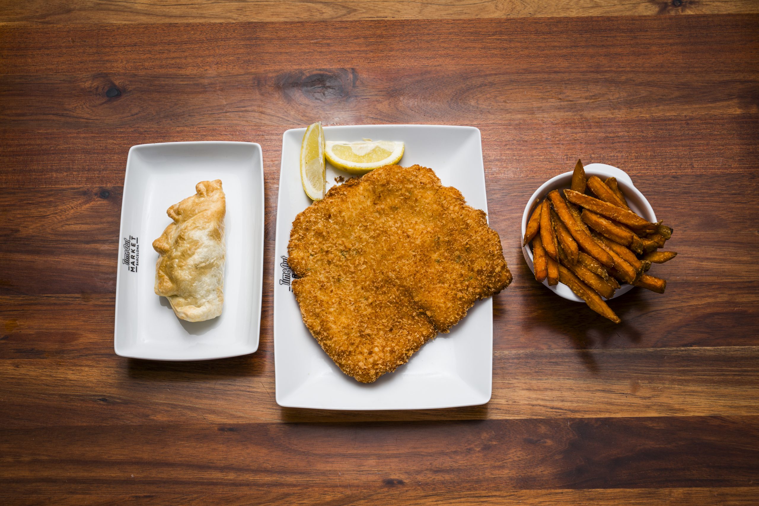 Milanesa napolitana con boniato acompañada de una deliciosa empanada de carne