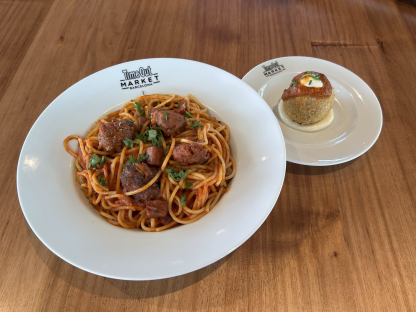 The classic Barceloneta bomba, served with spaghetti, tender meatballs, and fresh cuttlefish.