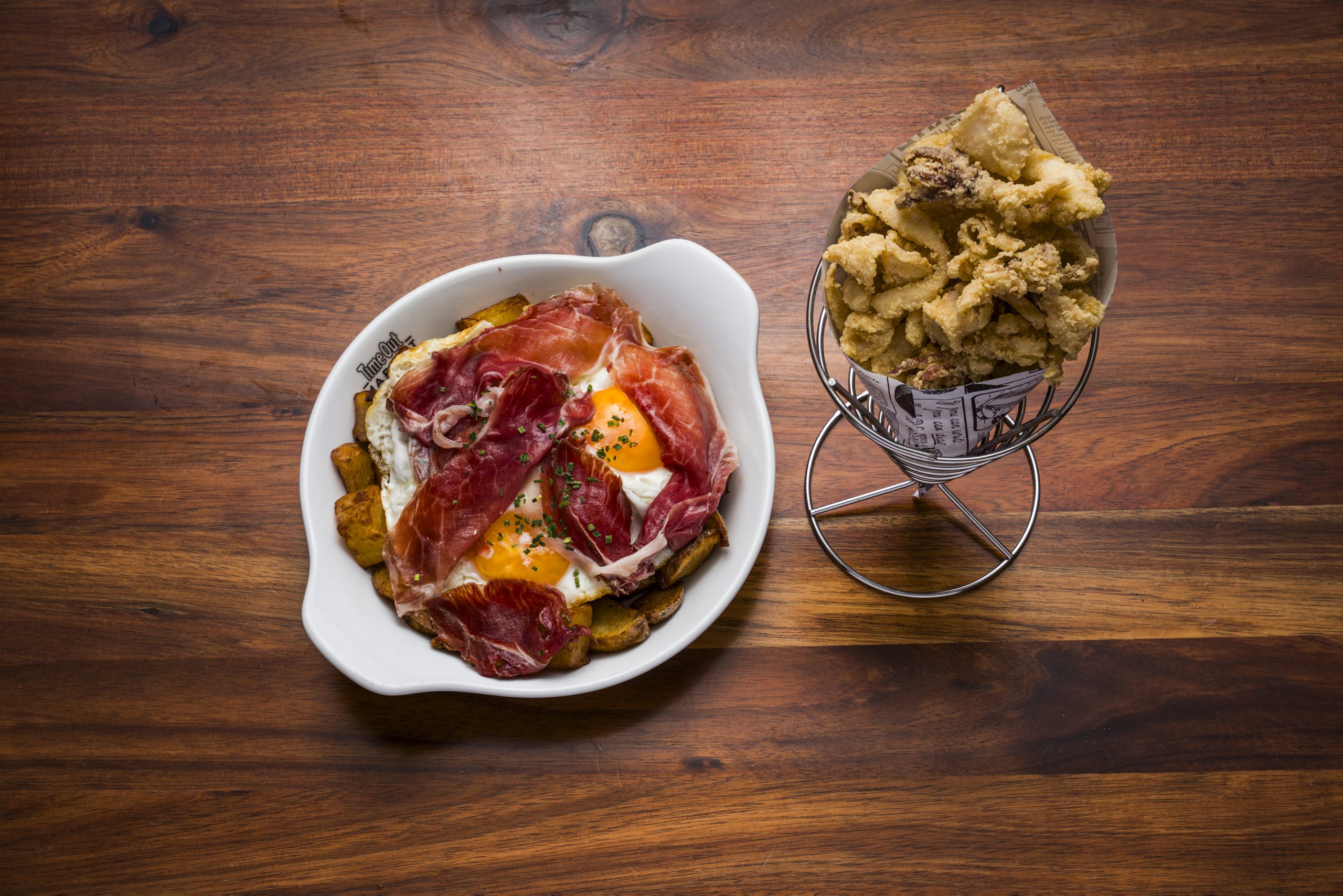 Huevos estrellados con jamón ibérico, acompañados de un cono de calamares con chips crujientes.