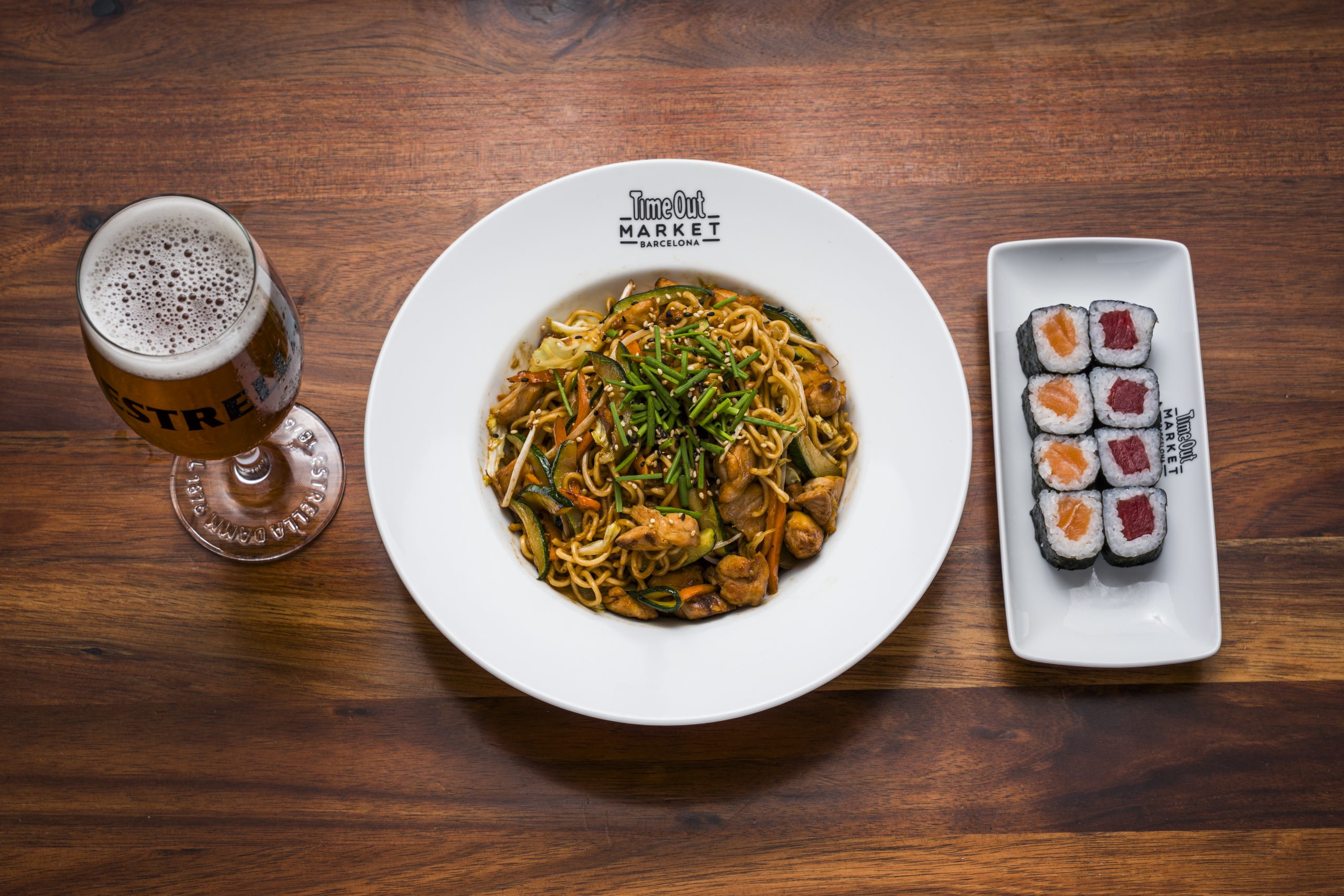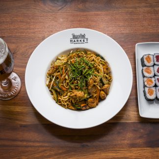 Yakisoba de pollo salteado con verduras frescas, acompañado de una selección de makis: 4 de atún y 4 de salmón.