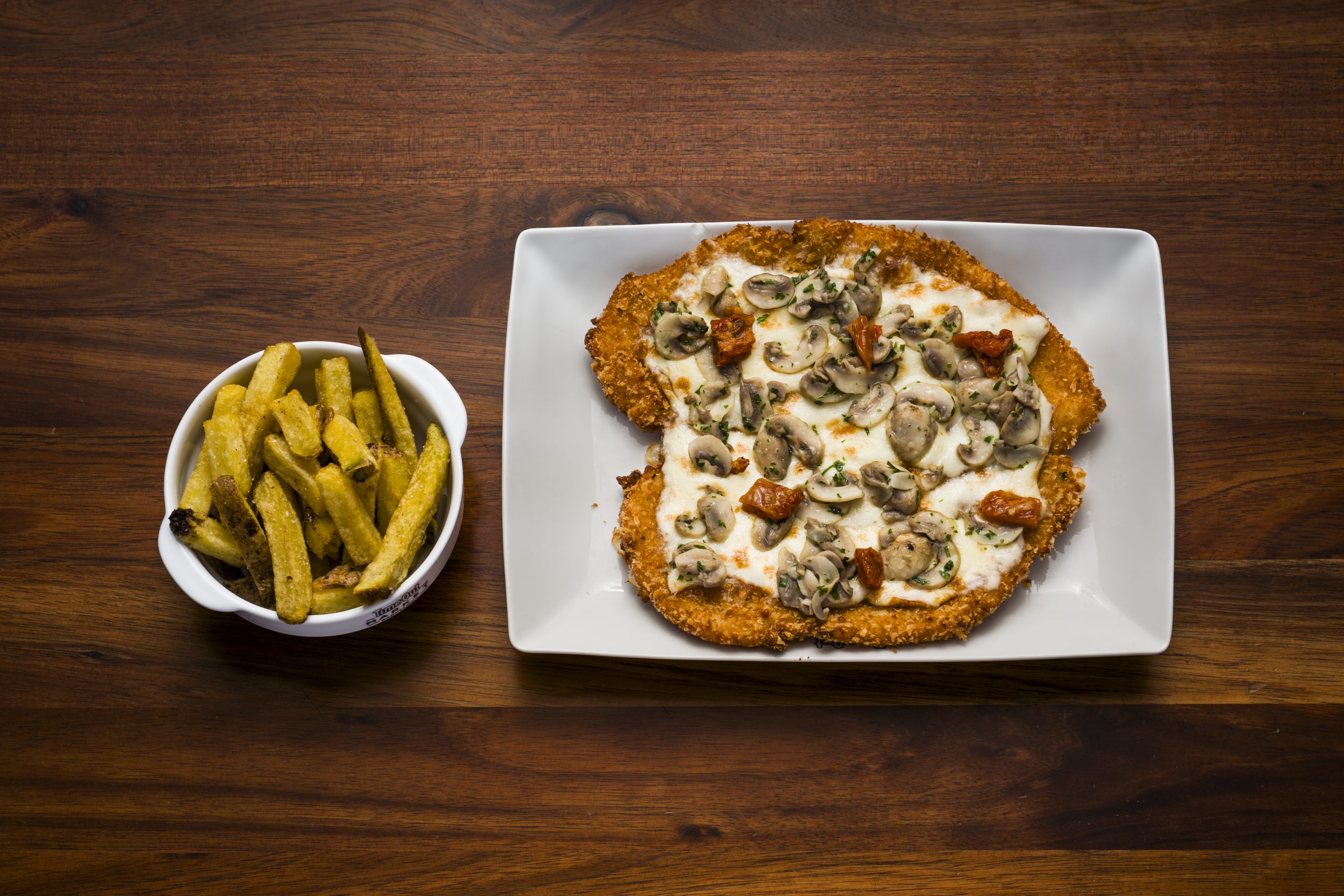 Milanesa de pollastre amb xampinyons, all i julivert i tomàquet sec, acompanyada amb patates fregides