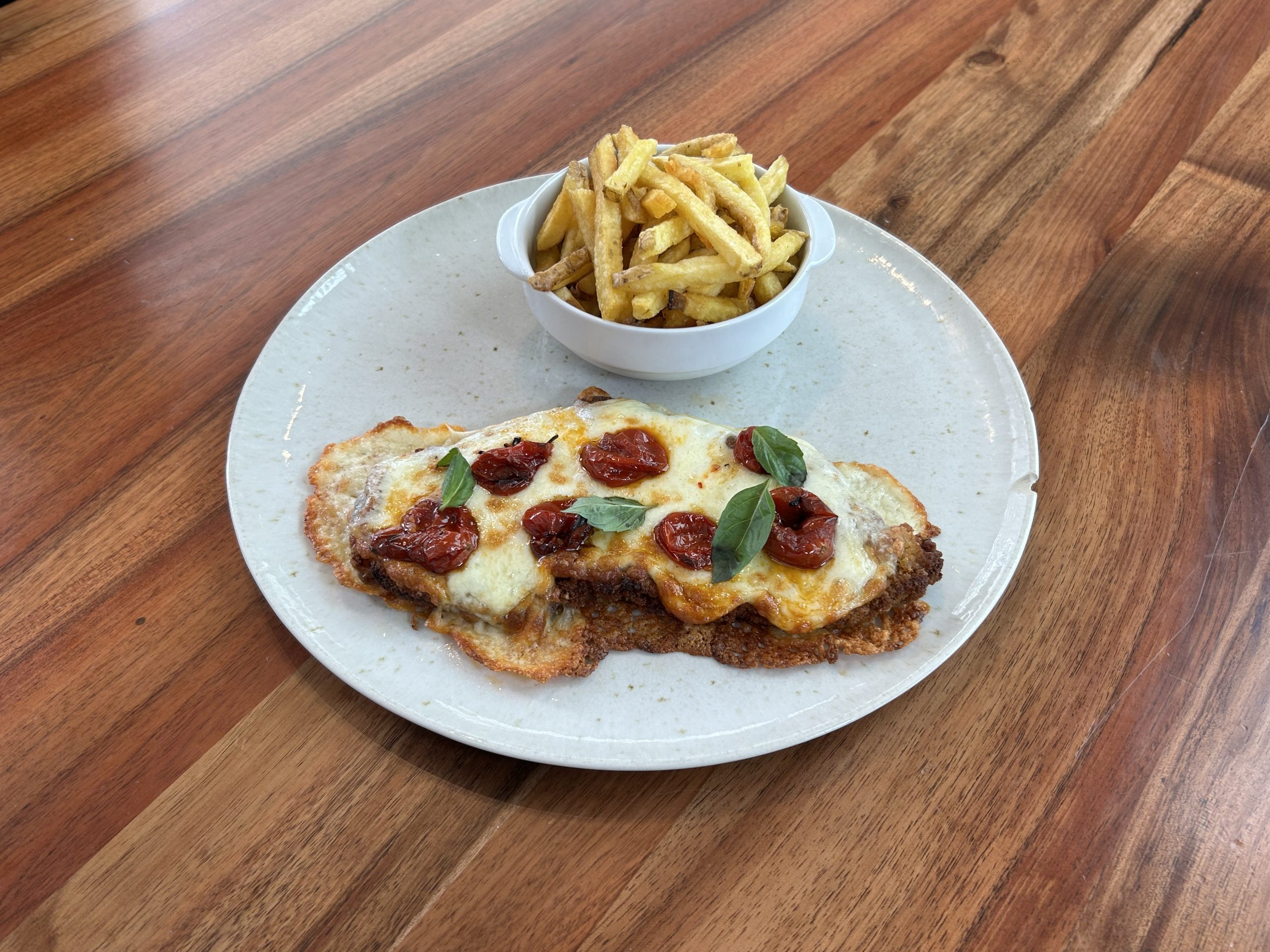 Milanesa de ternera frita y gratinada al horno de leña con mezcla de 3 quesos y tomates cherri asados, con patatas fritas