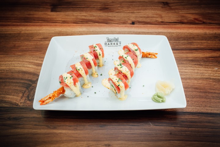 Llagostí en tempura, alvocat, tonyina i salsa “llet de tigre”