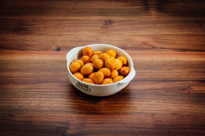 Olivas maceradas al mojo picón (salsa típica de las islas canarias) y mezcla de especies: ajo granulado, pimentón, comino molido, cayena molida