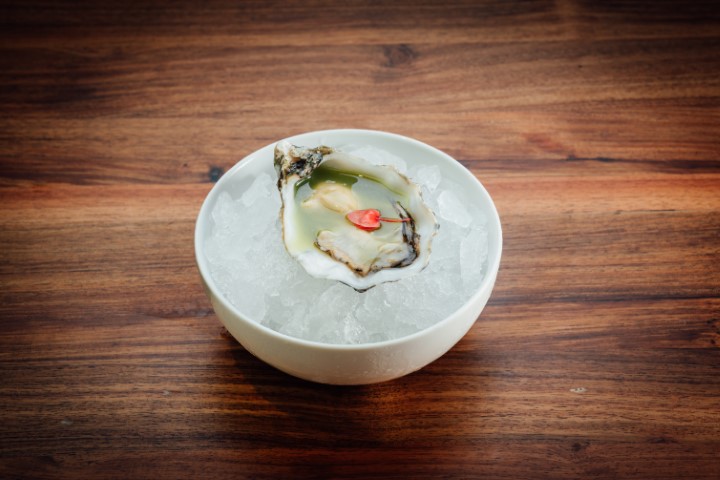 Ostra con manzana acida y shiso verde