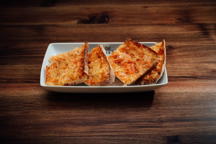 Pa torrat amb tomàquet triturat i oli d’oliva per sobre.