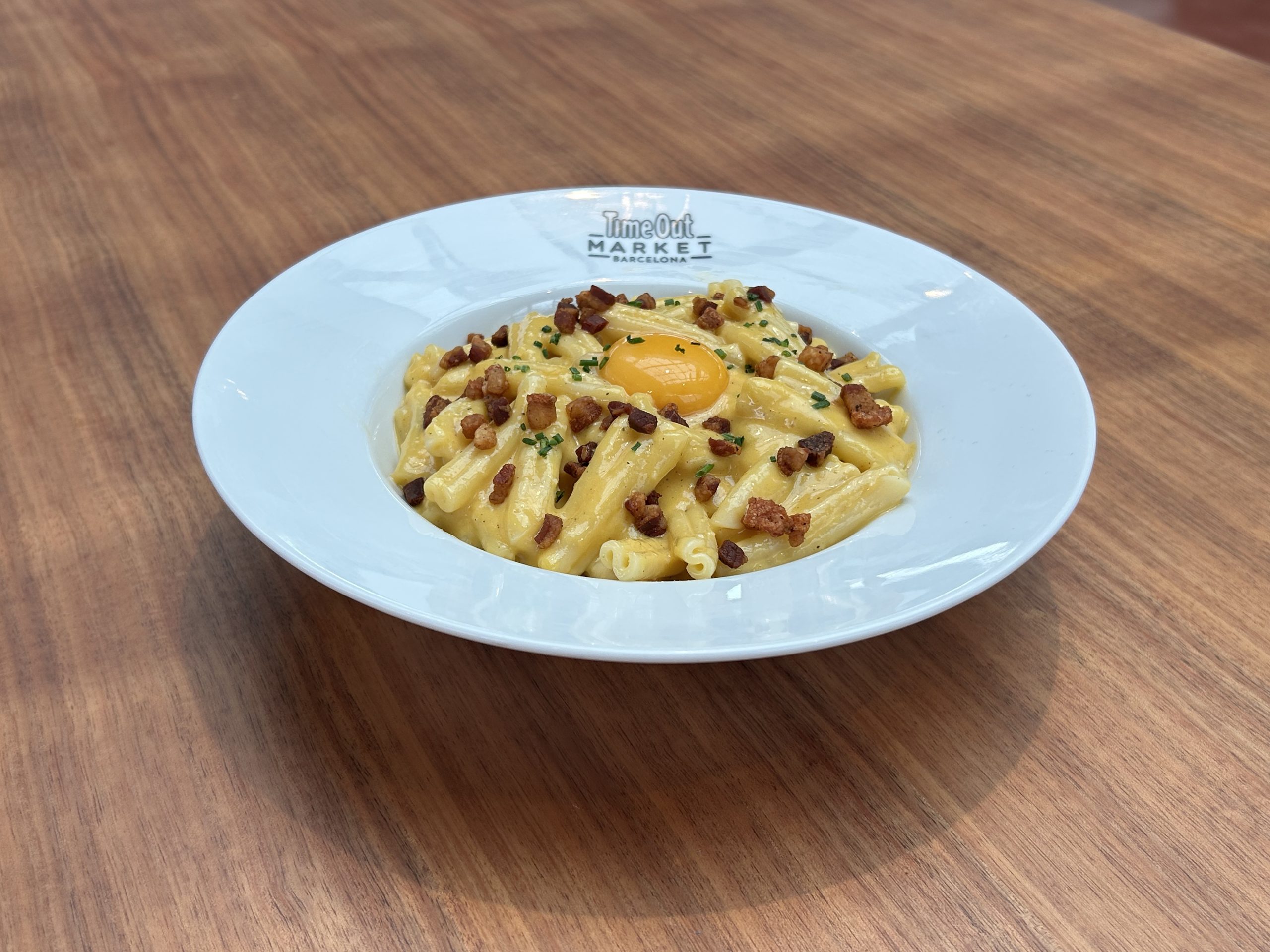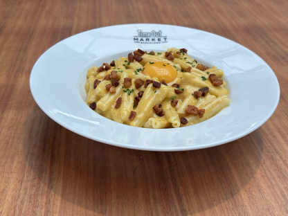 Pasta al dente con nuestra cremosa salsa carbonara casera, coronada con yema de huevo, panceta crujiente y parmesano.