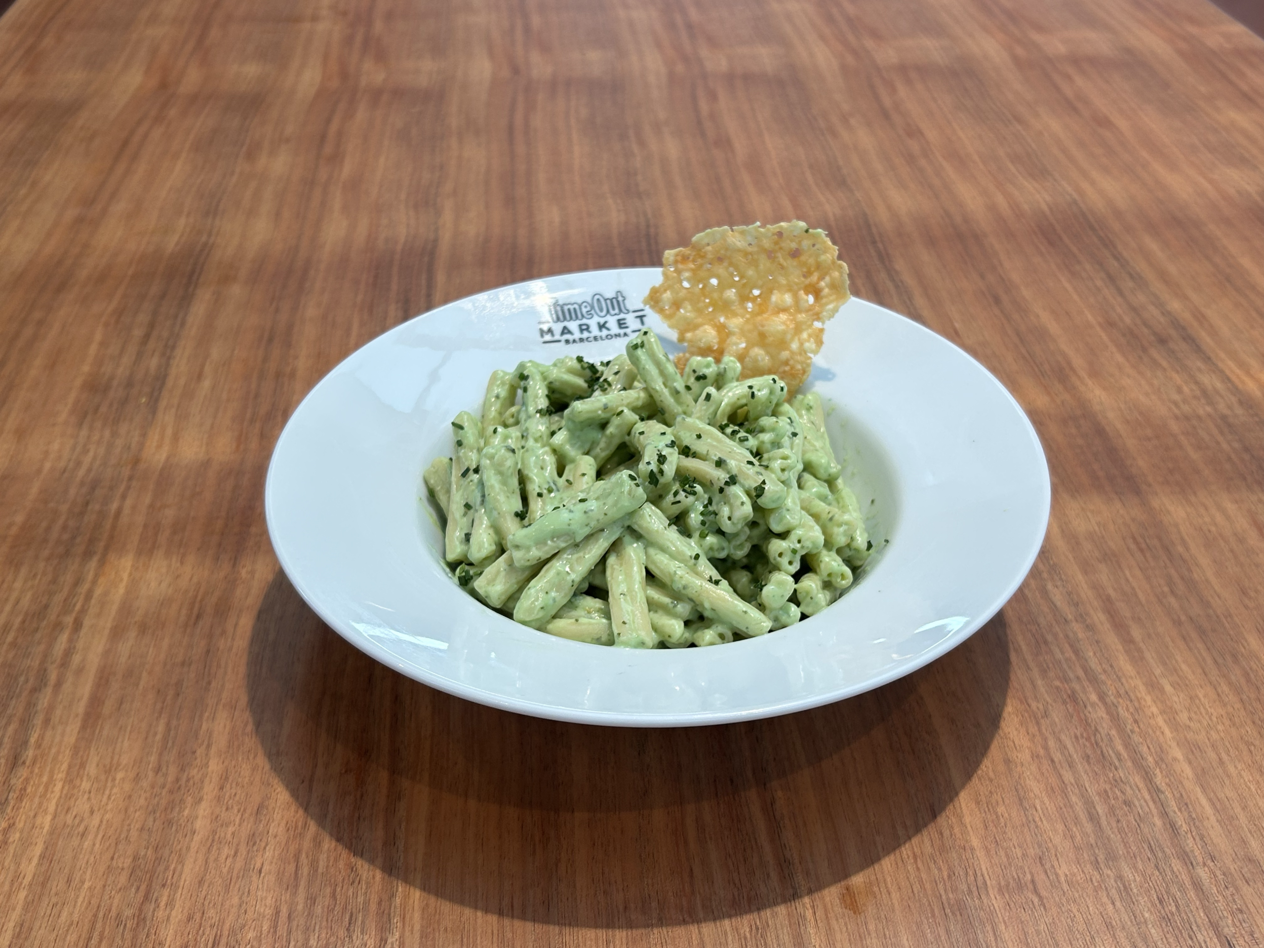 Pasta al dente mezclada con nuestra aromática salsa de pesto casera.