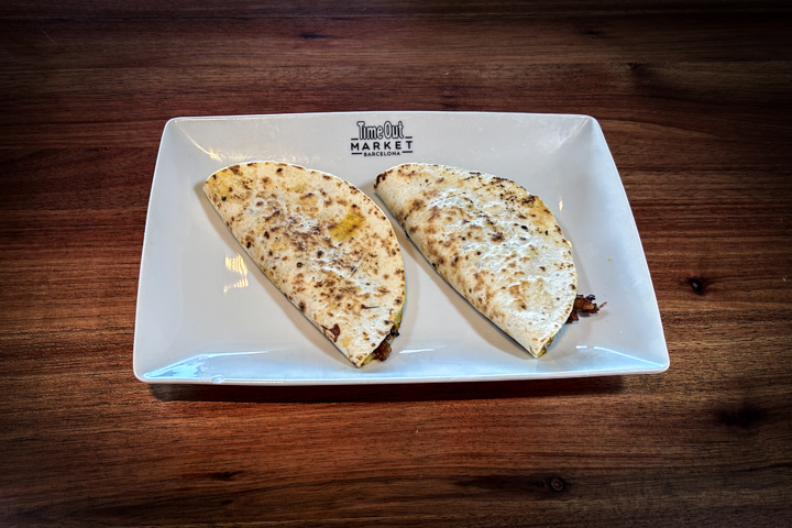 Quesadilla with Oaxaca cheese, grilled entrails, chives, cilantro, red sauce and avocado