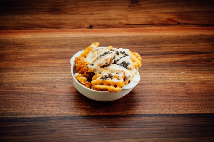 Patatas con crema de queso parmesano, queso parmesano y tartufata