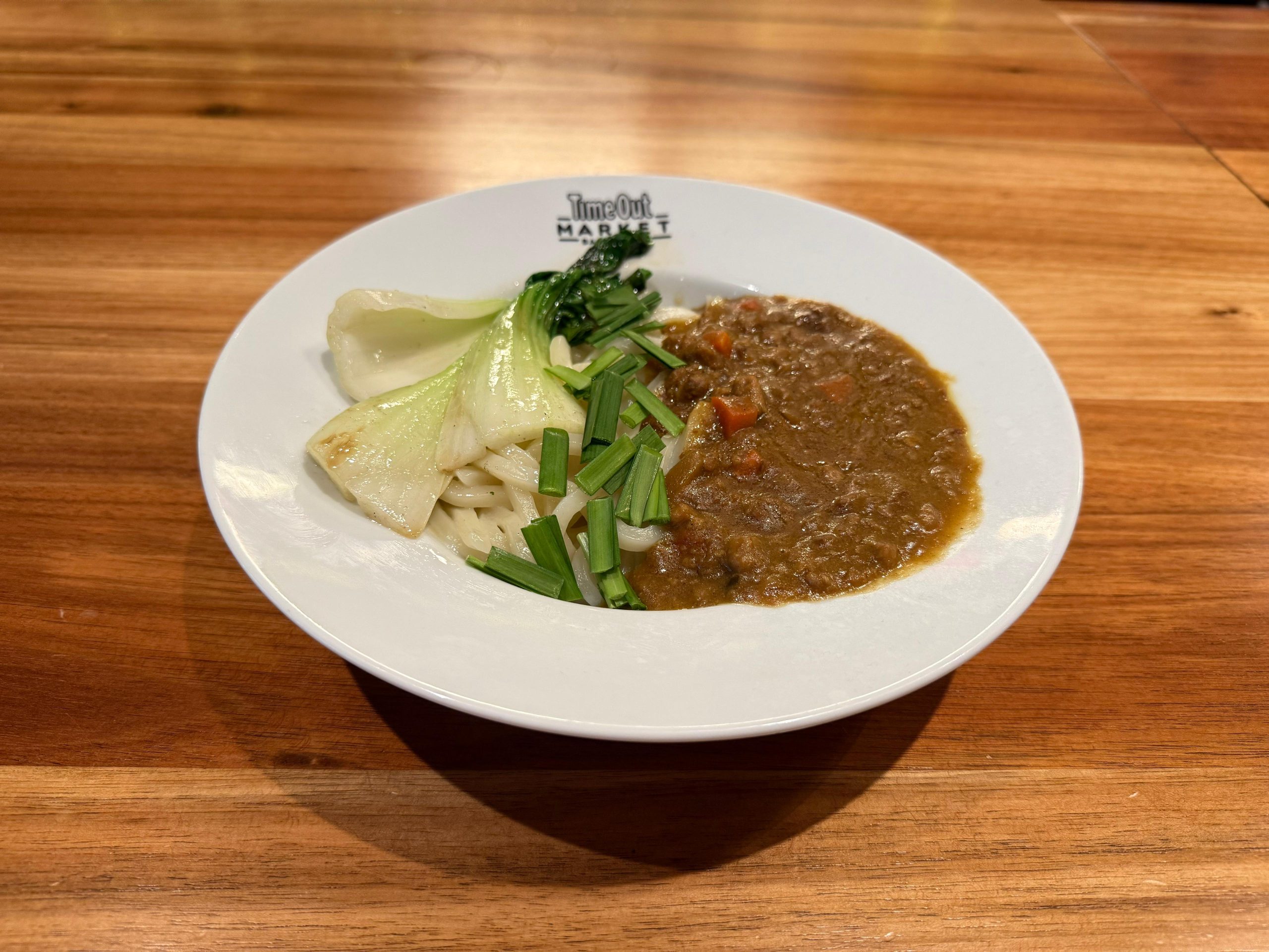 Fideos Udon frescos con ragú de cerdo al curry japonés, pak choi y nira