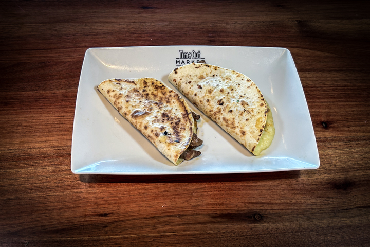 Quesadilla con queso Oaxaca, entraña a la plancha, cebolleta, cilantro, salsa roja y aguacate