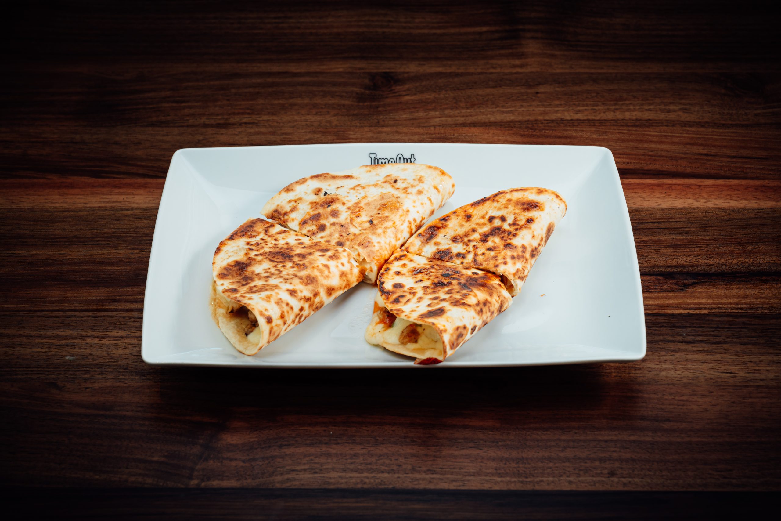 Quesadilla con queso Oaxaca, contra muslo de pollo a la plancha, cebolleta, cilantro, salsa roja y aguacate