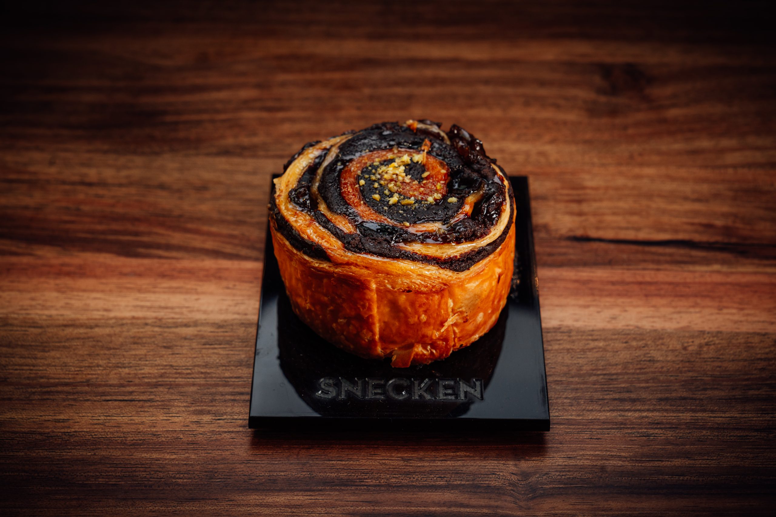Pastel elaborado con dos capas de bizcocho de chocolate y cremoso de chocolate mixto con una dulce compota de frambuesa fresca y recubierto con un brillante glaseado negro