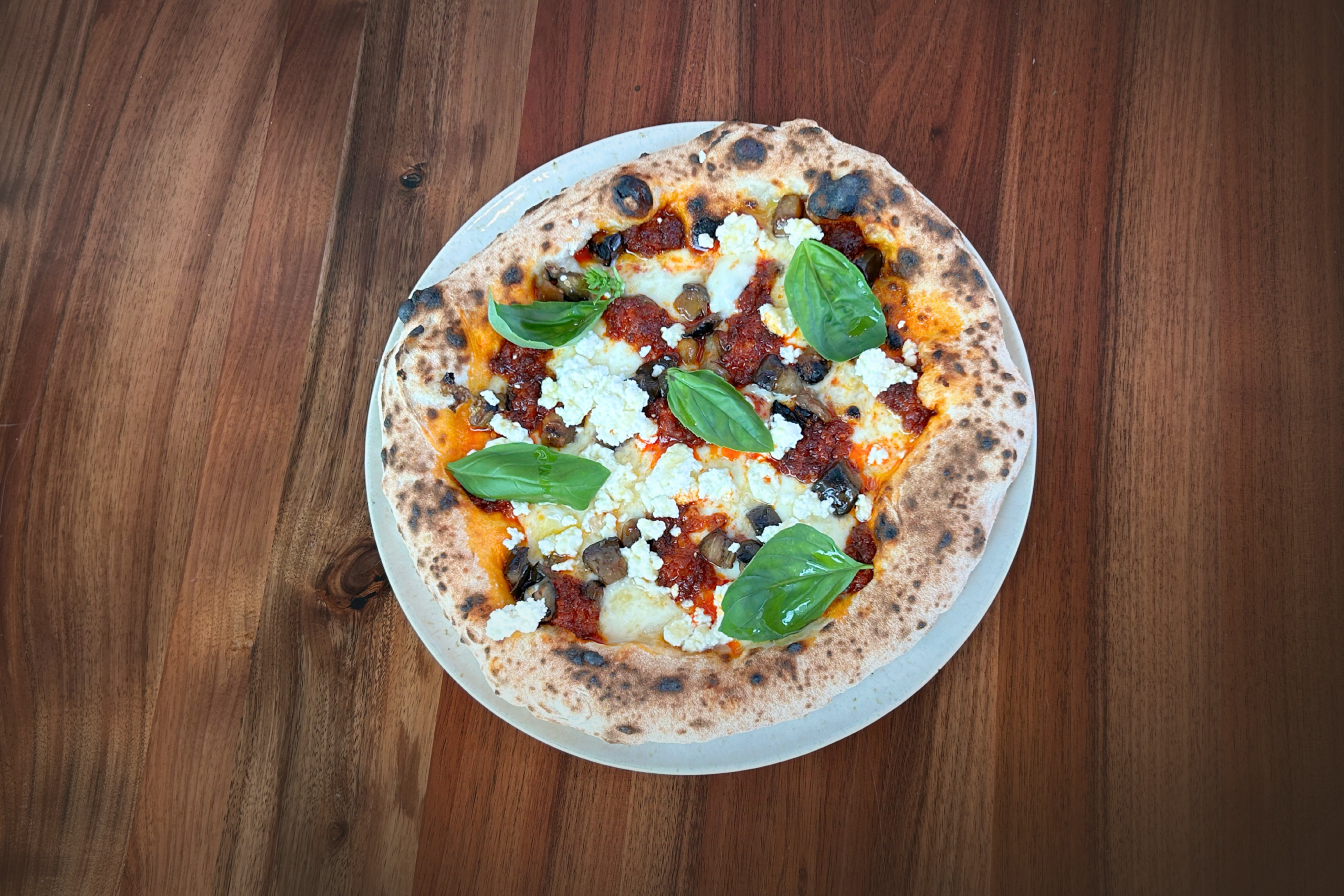 Tomato, mozzarella, eggplant, sobrasada, salted ricotta, and basil.