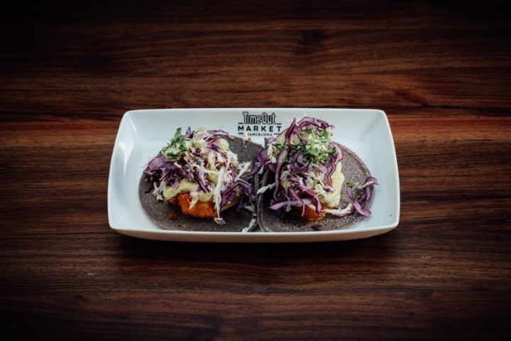 Taco con rebozado de cerveza negra, col, lombarda, puerro crujiente y emulsión de cilantro