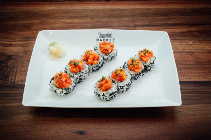 Atún, aguacate y queso crema, cubierto de atún marinado